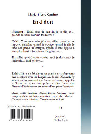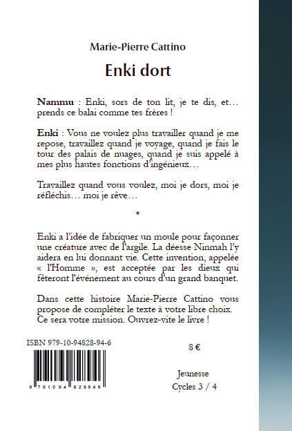 Enki a l’idée de fabriquer un moule pour façonner une créature avec de l'argile. La déesse Ninmah l’y aidera en lui donnant vie. Cette invention, appelée « l'Homme », est acceptée par les dieux qui fêteront l'événement au cours d'un grand banquet.Dans cette histoire Marie-Pierre Cattino vous propose de compléter le texte à votre libre choix. Ce sera votre mission.Le mythe mésopotamien d'Enki et Ninmah est une explication de la création de l'être humain par des dieux. Il date du milieu du IIe millénaire avant notre ère. À travers ce récit, les sumériens cherchaientà répondre aux questions : qui a créé les hommes, quels rapports ont-ils avec les dieux et pourquoi existe-t-il des êtres imparfaits ?Mais la perfection existe-elle ?Cette histoire philosophique peut être interprétée à tout âge.