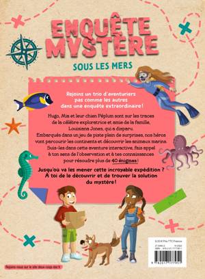 40 énigmes à résoudre avec Hugo, Mia et leur chien Péplum pour tenter de rejoindre la célèbre exploratrice et amie de la famille, Louisiana Jones, qui leur propose un jeu de pistes. Des Cherche & Trouve, de multiples jeux de logique et d'observation qui vont permettre de découvrir les animaux marins aux 4 coins du monde : en Méditerranée, dans l'océan Pacifique et dans l'océan Arctique, jusque dans leurs très grandes profondeurs...