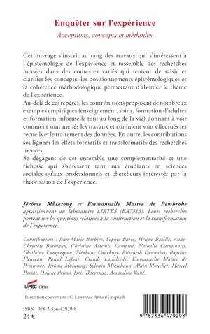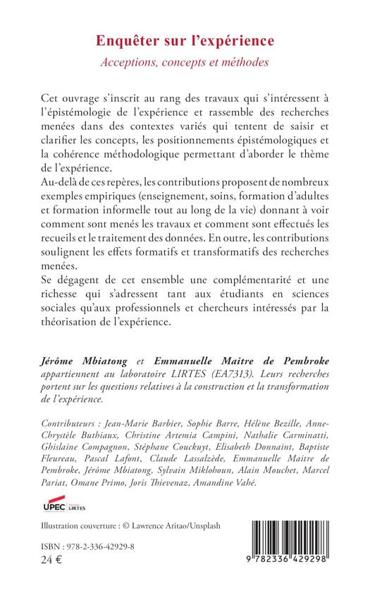 Cet ouvrage s'inscrit au rang des travaux qui 'intéressent à l'épistémologie de l'expérience et rassemble des recherches menées dans des contextes variés qui tentent de saisir et clarifier les concepts, les positionnements épistémologiques et la cohérence méthodologique permettant d'aborder le thème de l'expérience. Au-delà de ces repères, les contributions proposent de nombreux exemples empiriques (enseignement, soins, formation d'adultes et formation informelle et tout au long de la vie) donnant à voir comment sont menés les travaux et comment sont effectués les recueils et le traitement des données. En outre, les contributions soulignent les effets formatifs et transformatifs des recherches menées. Se dégagent de cet ensemble une complémentarité et une richesse qui s'adressent tant aux étudiants en sciences sociales qu'aux professionnels et chercheurs intéressés par la théorisation de l'expérience.