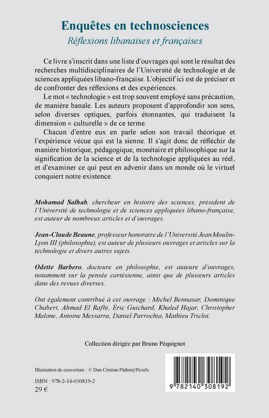 Ce livre s'inscrit dans une liste d'ouvrages qui sont le résultat des recherches multidisciplinaires de l'Université de technologie et de sciences appliquées libano-française. L'objectif ici est de préciser et de confronter des réflexions et des expériences. Le mot « technologie » est trop souvent employé sans précaution, de manière banale. Les auteurs proposent d'approfondir son sens, selon diverses optiques, parfois étonnantes, qui traduisent la dimension « culturelle » de ce terme. Chacun d'entre eux en parle selon son travail théorique et l'expérience vécue qui est la sienne. Il s'agit donc de réfl échir de manière historique, pédagogique, monétaire et philosophique sur la signification de la science et de la technologie appliquées au réel, et d'examiner ce qui peut en advenir dans un monde où le virtuel conquiert notre existence.