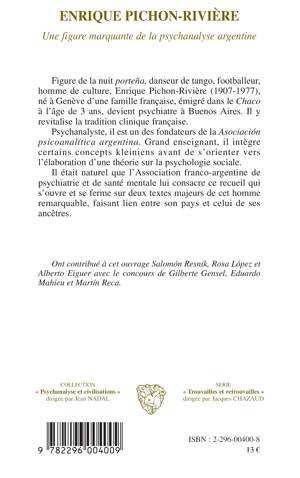 Enrique Pichon-Rivière (1907-1977) fut psychiatre à Buenos Aires. Il revitalisa la tradition clinique française. Psychanalyste, il est un des fondateurs de la Asociacion psicoanalitica argentina. Grand enseignant, il intègre certains concepts kleiniens avant de s'orienter vers l'élaboration d'une théorie sur la psychologie sociale. Il était naturel que l'Association franco-argentine de psychiatrie et de santé mentale lui consacre ce recueil qui s'ouvre et se ferme sur deux textes de cet homme remarquable.