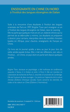 Suite à la rencontre d’une étudiante à l’Institut des langues orientales de Paris en 1997, Brigitte Tison part enseigner un an à l’Institut des langues étrangères de Dalian, dans le Liaoning. Elle ne parle que quelques mots en pin-yin, dialecte chinois qui lui permet de se débrouiller a minima. Les étudiants se préparent à devenir, pour certains, interprètes dans des sociétés chinoises basées en Afrique, pour d’autres, enseignants de français en Chine. Ce livre est le journal qu’elle a tenu au jour le jour, lors de cette année passée là-bas. Elle y met ses réflexions, son vécu à l’Institut en Chine, ce pays dont on parle tant depuis quelques années.