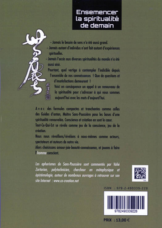 Jamais le besoin de sens n’a été aussi grand. Jamais autant d’individus n’ont fait des expériences spirituelles. Jamais l’accès aux diverses spiritualités du monde n’a été aussi aisé. Pourtant, quel vertige à contempler l’indicible depuis l’ensemble de nos connaissances ! Que de questions et d’insatisfactions demeurent ! Voici en conséquence un appel à un renouveau de la spiritualité pour s’adresser à qui nous sommes aujourd’hui avec les mots d’aujourd’hui. Avec des formules compactes et tranchantes comme celles des Guides d’antan, Maître Sans-Poussière pose les bases d’une spiritualité renouvelée. Conscience et création en sont le cœur. Tout-Ce-Qui-Est se révèle comme jeu de la conscience, jeu de la création. Nous nous réveillons/révélons à nous-mêmes comme acteurs, spectateurs et auteurs de notre vie. Alors choisissons amour-joie-beauté-connaissance, et jouons à faire l’homme conscient. Les aphorismes de Sans-Poussière sont commentés par Vahé Zartarian, polytechnicien, chercheur en métaphysique et épistémologie, auteur de nombreux ouvrages à retrouver sur son site Internet : www.co-creation.net.