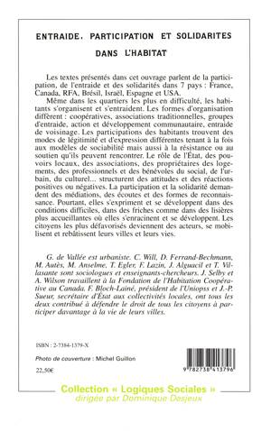 Les textes présentés dans cet ouvrage parlent de la participation, de l'entraide et des solidarités dans 7 pays : France, Canada, RFA, Brésil, Israël, Espagne et USA. Même dans les quartiers les plus en difficulté, les habitants s'organisent et s'entraident. Les formes d'organisation diffèrent : coopératives, associations traditionnelles, groupes d'entraide, action et développement communautaire, entraide de voisinage. Les participations des habitants trouvent des modes de légitimité et d'expression différentes tenant à la fois aux modèles de sociabilité mais aussi à la résistance ou au soutien qu'ils peuvent rencontrer. Le rôle de l'État, des pouvoirs locaux, des associations, des propriétaires des logements, des professionnels et des bénévoles du social, de l'urbain, du culturel... structurent des attitudes et des réactions positives ou négatives. La participation et la solidarité demandent des médiations, des écoutes et des formes de reconnaissance. Pourtant, elles s'expriment et se développent dans des conditions difficiles, dans des friches comme dans des lisières plus accueillantes où elles s'enracinent et se développent. Les citoyens les plus défavorisés deviennent des acteurs, se mobilisent et rebâtissent leurs villes et leurs vies.