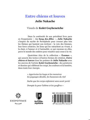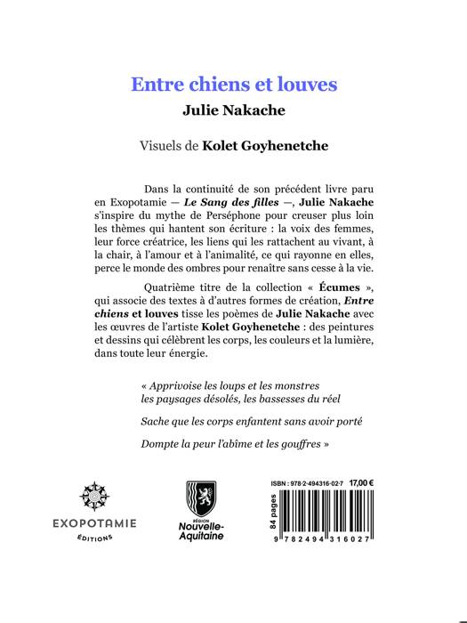 Dans la continuité de son précédent livre paru en Exopotamie — Le Sang des filles —, Julie Nakaches’inspire du mythe de Perséphone pour creuser plus loin les thèmes qui hantent son écriture : la voix des femmes, leur force créatrice, les liens qui les rattachent au vivant, à la chair, à l’amour et à l’animalité, ce qui rayonne en elles, perce le monde des ombres pour renaître sans cesse à la vie. Quatrième titre de la collection « Écumes », qui associe des textes à d’autres formes de création, Entre chiens et louves tisse les poèmes de Julie Nakache avec les œuvres de l’artiste Kolet Goyhenetche : des peintures et dessins qui célèbrent les corps, les couleurs et la lumière, dans toute leur énergie.