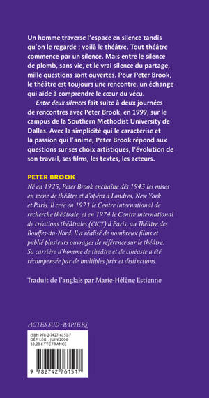 Un homme traverse l'espace en silence tandis qu'on le regarde ; voilà le théâtre. Tout théâtre commence par un silence. Mais entre le silence de plomb, sans vie, et le vrai silence du partage, mille questions sont ouvertes. Pour Peter Brook, le théâtre est toujours une rencontre, un échange qui aide à comprendre le coeur du vécu. «Entre deux silences» fait suite à deux journées de rencontres avec Peter Brook, en 1999, sur le campus de la Southern Methodist University de Dallas. Avec la simplicité qui le caractérise et la passion qui l'anime, Peter Brook répond aux questions sur ses choix artistiques, l'évolution de son travail, ses films, les textes, les acteurs.