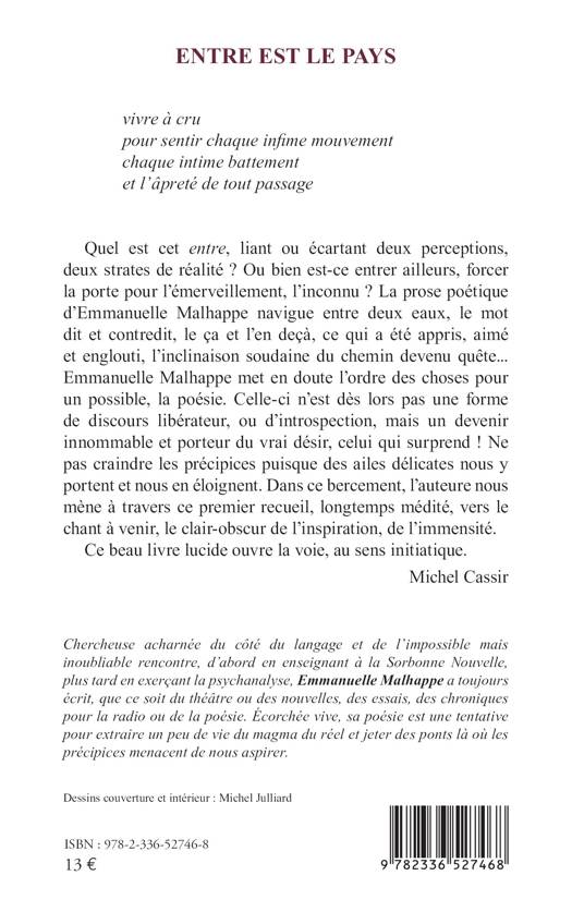 entre, liant ou écartant deux perceptions, deux strates de réalité ? Ou bien est-ce entrer ailleurs, forcer la porte pour l'émerveillement, l'inconnu ? La prose poétique d'Emmanuelle Malhappe navigue entre deux eaux, le mot dit et contredit, le ça et l'en deçà, ce qui a été appris, aimé et englouti, l'inclinaison soudaine du chemin devenu quête... Emmanuelle Malhappe met en doute l'ordre des choses pour un possible, la poésie. Celle-ci n'est dès lors pas une forme de discours libérateur, ou d'introspection, mais un devenir innommable et porteur du vrai désir, celui qui surprend ! Ne pas craindre les précipices puisque des ailes délicates nous y portent et nous en éloignent. Dans ce bercement, l'auteure nous mène à travers ce premier recueil, longtemps médité, vers le chant à venir, le clair-obscur de l'inspiration, de l'immensité.