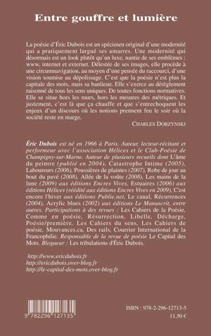 La poésie d'Eric Dubois est un spécimen original d'une modernité qui a pratiquement largué ses amarres. Une modernité qui désormais est un look plutôt qu'un luxe, nantie de ses emblèmes : www, internet et extranet. Délestée de ses images, elle procède à une circumnavigation, au moyen d'une pensée du raccourci, d'une vision soumise au dépolissage. C'est que la poésie n'est plus la capitale des mots, mais sa banlieue. Elle s'exerce au dérèglement raisonné de tous les sens uniques. De toutes fonctions narratives...