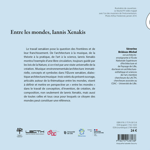 Le travail xenakien pose la question des frontières et de leur franchissement. De l’architecture à la musique, de la théorie à la pratique, de l’art à la science, Iannis Xenakis montra l’exemple d’une libre circulation, toujours guidé par les lois de la Nature, si ce n’est par une visée universelle de la création. Musique environnementale/architecture immatérielle, concepts et symboles dans l’OEuvre xenakien, dialectique architecture/musique : trois volets du présent ouvrage, articulés autour de la thématique entre les mondes, visent à définir et mettre en perspective un « entre les mondes » dans le travail de conception, d’invention, de création, de composition, non seulement de Iannis Xenakis, mais aussi de toutes celles et tous ceux pour lesquels ce citoyen des mondes peut constituer une référence.