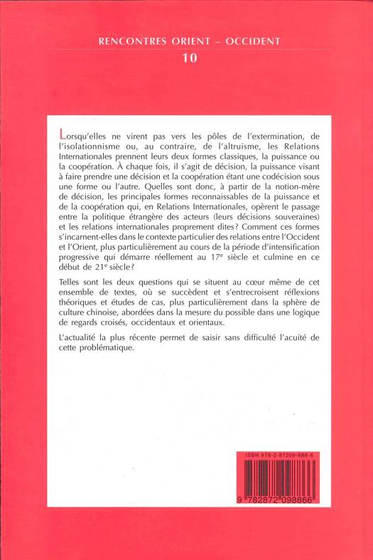 Cet ouvrage présente les principales formes reconnaissables de la puissance et de la coopération qui, en relations internationales, opèrent le passage entre la politique étrangère des acteurs et les relations internationales proprement dites, et la façon dont ces formes s'incarnent dans le contexte particulier des relations entre l'Orient et l'Occident.