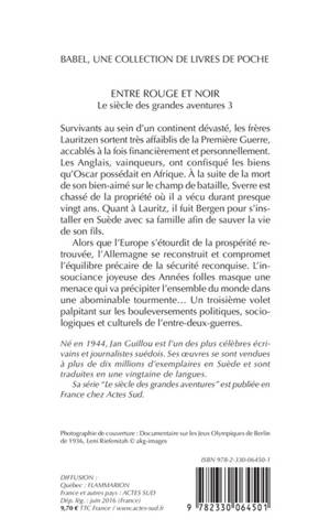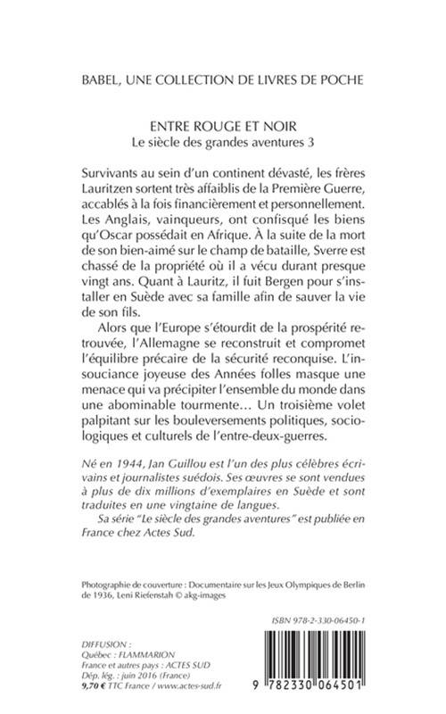 «Entre rouge et noir», troisième tome de la passionnante série «Le Siècle des grandes aventures »consacrée aux bouleversements qui ont ébranlé l'Europe du xxe siècle, invite à une plongée captivante dans les années 1920 et 1930. Alors que le continent panse encore les blessures de la Première Guerre, des évolutions souterraines l'entraînent vers un nouveau conflit, encore plus sanglant. À travers la destinée de la fratrie Lauritzen, Jan Guillou inscrit l'Histoire au coeur des destinées individuelles.