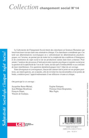 Le laboratoire de Changement Social réunit des chercheurs en Sciences Humaines qui inscrivent leurs travaux dans une orientation clinique. Ces chercheurs considèrent que s'en tenir aux déterminations sociologiques en y subordonnant les déterminations psychologiques, ou l'inverse, ne permet pas de traiter de la complexité des conditions d'émergence et de constitution du sujet social et de ses productions saisies dans leurs contextes. Entre divergences et convergences, voici des éléments pour approfondir une réflexion vivante et critique.