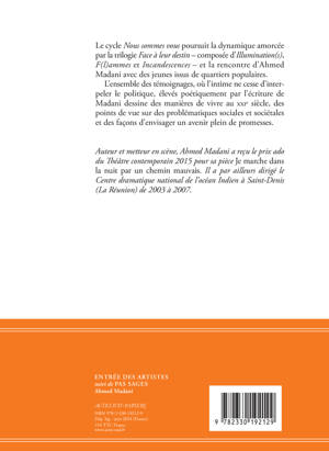 Le cycle Nous sommes vous poursuit la dynamique amorcée par la trilogie Face à leur destin - composée d'Illumination(s), F(l)ammes et Incandescences - et la rencontre d'Ahmed Madani avec des jeunes issus de quartiers populaires.