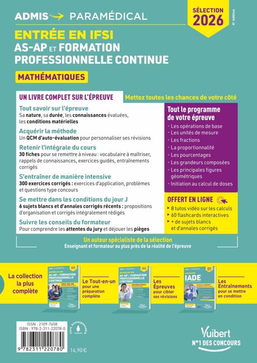 Un livre complet pour réussir l'épreuve de mathématiques et intégrer l'IFSI de votre choix en 2026 !Dans le cadre de la sélection en IFSI, pour vous, candidats AS-AP qui relevez de la formation professionnelle continue, vous devez passer une sous-épreuve écrite de calculs simples.