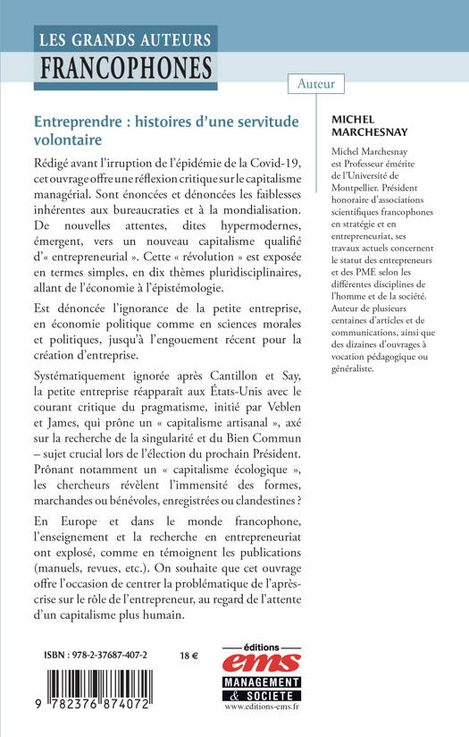 Rédigé avant l'irruption de l'épidémie de la Covid-19, cet ouvrage offre une réflexion critique sur le capitalisme managérial. Sont énoncées et dénoncées les faiblesses inhérentes aux bureaucraties et à la mondialisation. De nouvelles attentes, dites hypermodernes, émergent, vers un nouveau capitalisme qualifié d'« entrepreneurial ». Cette « révolution » est exposée en termes simples, en dix thèmes pluridisciplinaires, allant de l'économie à l'épistémologie. Est dénoncée l'ignorance de la petite entreprise, en économie politique comme en sciences morales et politiques, jusqu'à l'engouement récent pour la création d'entreprise. Systématiquement ignorée après Cantillon et Say, la petite entreprise réapparaît aux États-Unis avec le courant critique du pragmatisme, initié par Veblen et James, qui prône un « capitalisme artisanal », axé sur la recherche de la singularité et du Bien Commun – sujet crucial lors de l'élection du prochain Président. Prônant notamment un « capitalisme écologique », les chercheurs révèlent l'immensité des formes, marchandes ou bénévoles, enregistrées ou clandestines ? En Europe et dans le monde francophone, l'enseignement et la recherche en entrepreneuriat ont explosé, comme en témoignent les publications (manuels, revues, etc.). On souhaite que cet ouvrage offre l'occasion de centrer la problématique de l'après-crise sur le rôle de l'entrepreneur, au regard de l'attente d'un capitalisme plus humain.