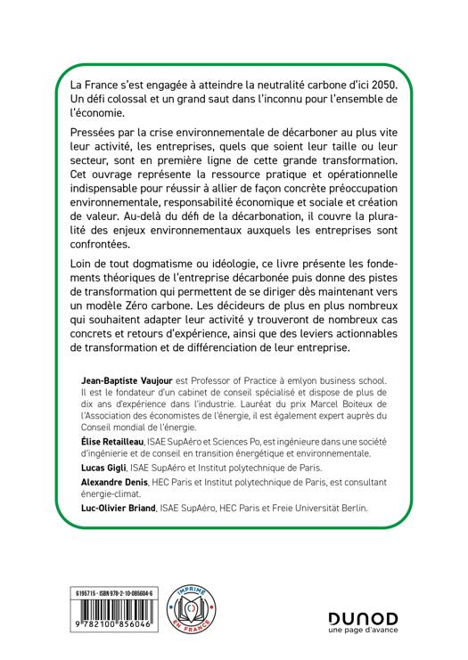 Loin de tout dogmatisme ou idéologie, ce livre présente les fondements théoriques de l’entreprise décarbonée puis donne des pistes de transformation qui permettent de se diriger dès maintenant vers un modèle Zéro carbone. Les décideurs de plus en plus nombreux qui souhaitent adapter leur activité y trouveront de nombreux cas concrets et retours d’expérience, ainsi que des leviers actionnables de transformation et de différenciation de leur entreprise.