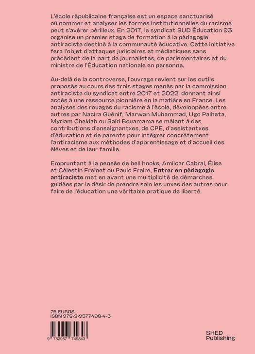 L'école républicaine française est un espace où nommer et analyser les les formes institutionnelles du racisme peut s'avérer périlleux. En 2017, le syndicat SUD Éducation 93 organise un stage de formation à la pédagogie antiraciste destiné à la communauté éducative, qui fera l'objet d'attaques judiciaires et médiatiques sans précédent. Au-delà de la controverse, l'ouvrage revient sur les outils proposés au cours des stages préparés par la commission antiraciste du syndicat donnant ainsi accès à une ressource pionnière en la matière en France. Les analyses des rouages du racisme à l'école se mêlent à des contributions d'enseignantxes, de CPE, d'assistantxes d'éducation et de parents pour intégrer concrètement l'antiracisme aux méthodes d'apprentissage et d'accueil des élèves et de leur famille. Empruntant à la pensée de bell hooks, Amílcar Cabral, Élise et Célestin Freinet ou Paulo Freire, Entrer en pédagogie antiraciste met en avant une multiplicité de démarches.