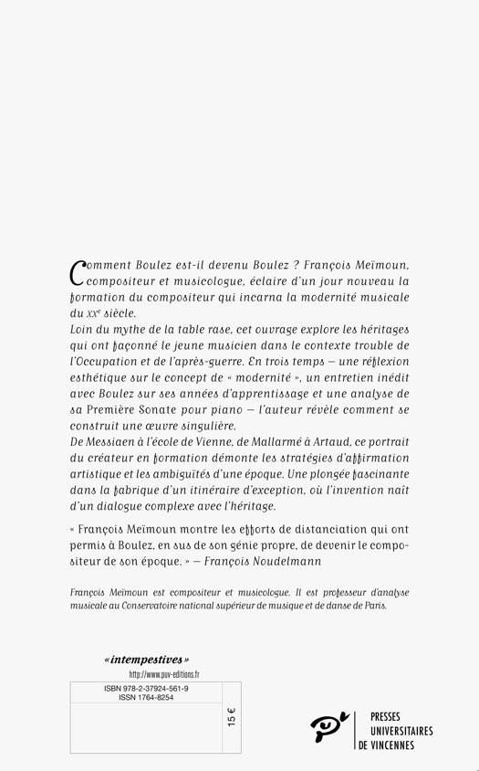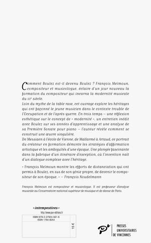 Loin du mythe de la table rase, cet ouvrage explore les héritages qui ont façonné le jeune musicien dans le contexte trouble de l’Occupation et de l’après-guerre. En trois temps – une réflexion esthétique sur le concept de « modernité », un entretien inédit avec Boulez sur ses années d’apprentissage, et une analyse de sa Première Sonate pour piano – l’auteur révèle comment se construit une œuvre singulière.