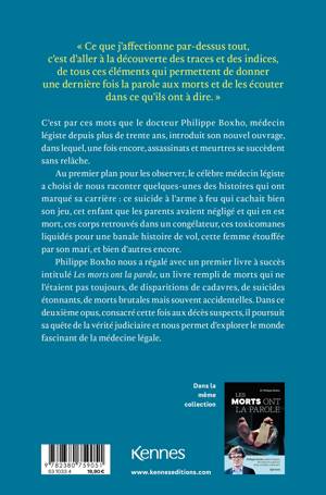 « Ce que j’affectionne par-dessus tout, c’est d’aller à la découverte des traces et des indices, de tous ces éléments qui permettent de donner une dernière fois la parole aux morts et de les écouter dans ce qu’ils ont à dire. » C’est par ces mots que le docteur Philippe Boxho, médecin légiste depuis plus de trente ans, introduit son nouvel ouvrage, dans lequel, une fois encore, assassinats et meurtres se succèdent sans relâche.