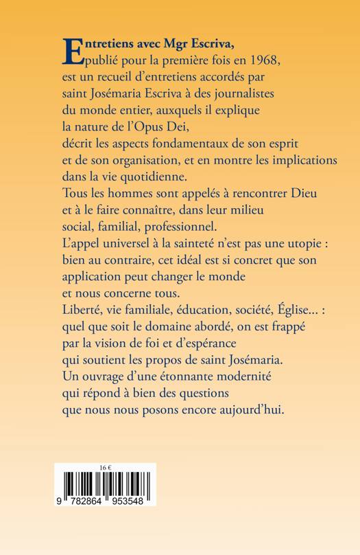 Entretiens avec Mgr Escriva, publié pour la première fois en 1968, est un recueil d'entretiens accordés par saint Josémaria Escriva à des journalistes du monde entier, auxquels il explique la nature de l'Opus Dei, décrit les aspects fondamentaux de son esprit et de son organisation, et en montre les implications dans la vie quotidienne. Tous les hommes sont appelés à rencontrer Dieu et à le faire connaîtren dans leur milieu social, familial, professionnel. L'appel universel à la sainteté n'est pas une utopie : bien au contraire, cet idéal est si concret que son application peut changer le monde et nous concerne tous. Liberté, vie familiale, éducation, société, Eglise... : quel que soit le domaine abordé, on est frappé par la vision de foi et d'espérance qui soutient les propos de saint Josémaria. Un ouvrage d'une étonnante modernité qui répond à bien des questions que nous nous posons encore aujourd'hui.