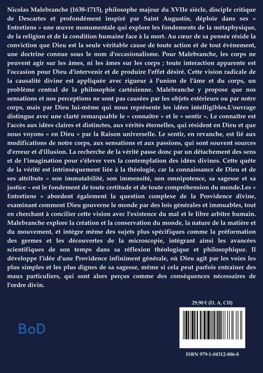 Nicolas Malebranche (1638-1715), philosophe majeur du XVIIe siècle, disciple critique de Descartes et profondément inspiré par Saint Augustin, déploie dans ses « Entretiens » une oeuvre monumentale qui explore les fondements de la métaphysique, de la religion et de la condition humaine face à la mort. Au coeur de sa pensée réside la conviction que Dieu est la seule véritable cause de toute action et de tout événement, une doctrine connue sous le nom d'occasionalisme. Pour Malebranche, les corps ne peuvent agir sur les âmes, ni les âmes sur les corps ; toute interaction apparente est l'occasion pour Dieu d'intervenir et de produire l'effet désiré. Cette vision radicale de la causalité divine est appliquée avec rigueur à l'union de l'âme et du corps, un problème central de la philosophie cartésienne. Malebranche y propose que nos sensations et nos perceptions ne sont pas causées par les objets extérieurs ou par notre corps, mais par Dieu lui-même qui nous représente les idées intelligibles.L'ouvrage distingue avec une clarté remarquable le « connaître » et le « sentir ». Le connaître est l'accès aux idées claires et distinctes, aux vérités éternelles, qui résident en Dieu et que nous voyons « en Dieu » par la Raison universelle. Le sentir, en revanche, est lié aux modifications de notre corps, aux sensations et aux passions, qui sont souvent sources d'erreur et d'illusion. La recherche de la vérité passe donc par un détachement des sens et de l'imagination pour s'élever vers la contemplation des idées divines. Cette quête de la vérité est intrinsèquement liée à la théologie, car la connaissance de Dieu et de ses attributs - son immutabilité, son immensité, son omnipotence, sa sagesse et sa justice - est le fondement de toute certitude et de toute compréhension du monde.Les « Entretiens » abordent également la question complexe de la Providence divine, examinant comment Dieu gouverne le monde par des lois générales et immuables, tout en cherchant à concilier cette vision avec l'existence du mal et le libre arbitre humain. Malebranche explore la création et la conservation du monde, la nature de la matière et du mouvement, et intègre même des sujets plus spécifiques comme la préformation des germes et les découvertes de la microscopie, intégrant ainsi les avancées scientifiques de son temps dans sa réflexion théologique et philosophique. Il développe l'idée d'une Providence infiniment générale, où Dieu agit par les voies les plus simples et les plus dignes de sa sagesse, même si cela peut parfois entraîner des maux particuliers, qui sont alors perçus comme des conséquences nécessaires de l'ordre divin.