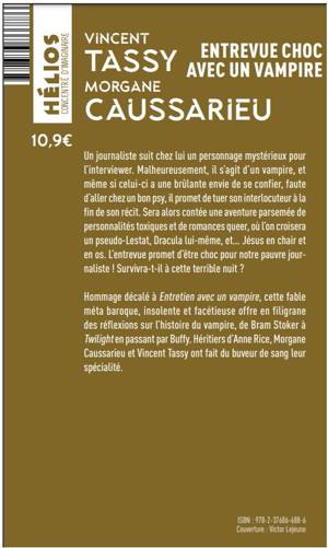 Un journaliste suit chez lui un personnage mystérieux pour l'interviewer. Malheureusement, il s'agit d'un vampire, et même si celui-ci a une brûlante envie de se confier, faute d'aller chez un bon psy, il promet de tuer son interlocuteur à la fin de son récit. Sera alors contée une aventure parsemée de personnalités toxiques et de romances queer, où l'on croisera un pseudo-Lestat, Dracula lui-même, et... Jésus en chair et en os. L'entrevue promet d'être choc pour notre pauvre journaliste ! Survivra-t-il à cette terrible nuit ? Hommage décalé à Entretien avec un vampire, cette fable méta baroque, insolente et facétieuse offre en filigrane des réflexions sur l'histoire du vampire, de Bram Stoker à Twilight en passant par Buffy. Héritiers d'Anne Rice, Morgane Caussarieu et Vincent Tassy ont fait du buveur de sang leur spécialité.
