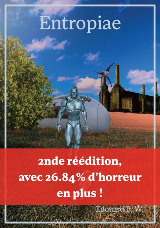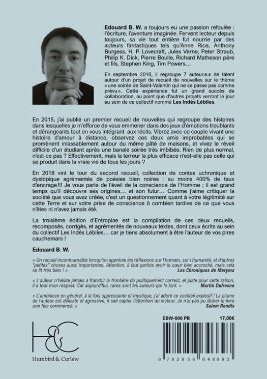 En 2015, j’ai publié un premier recueil de nouvelles qui regroupe des histoires dans lesquelles je m’efforce de vous emmener dans des jeux d’émotions troublants et dérangeants tout en vous intégrant aux récits. Vibrez avec ce couple vivant une histoire d’amour à distance, observez ces deux amis improbables qui se promènent inlassablement autour du même pâté de maisons, et vivez le réveil difficile d’un étudiant après une banale soirée très imbibée. Rien de plus normal, n’est-ce pas ? Effectivement, mais la terreur la plus efficace n’est-elle pas celle qui se produit dans la vraie vie de tous les jours ? En 2018 vint le tour du second recueil, collection de contes uchronique et dystopique agrémentés de poésies bien noires : au moins 400% de taux d’encrage !!! Je vous parle de l’éveil de la conscience de l’Homme ; il est grand temps qu’il découvre ses origines… et son futur… Comme j’aime critiquer la société que vous avez créée, c’est un questionnement quant à votre légitimité sur cette Terre et sur votre prise de conscience ô combien tardive de ce que vous n’êtes ni n’avez jamais été. La troisième édition d’Entropiae est la compilation de ces deux recueils, recomposés, corrigés, et agrémentés de nouveaux textes, dont ceux écrits au sein du collectif Les Indés Lébiles… car je tiens absolument à être l’auteur de vos pires cauchemars ! Edouard B. W. « Un recueil incontournable lorsqu'on apprécie les réflexions sur l'humain, sur l'humanité, et d'autres "petites" choses aussi importantes. Attention, il faut parfois avoir le cœur bien accroché, mais cela se lit très bien ! » Les Chroniques de Meryma