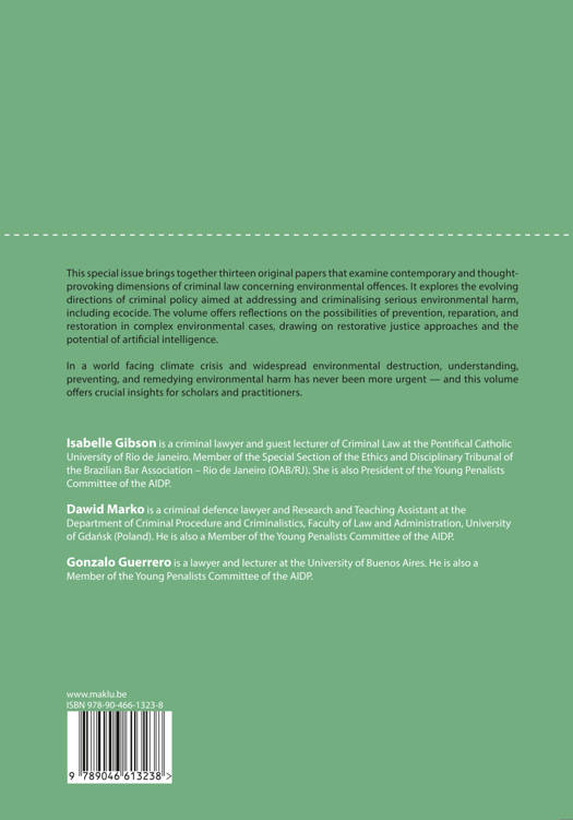 This special issue brings together thirteen original papers that examine contemporary and thoughtprovoking dimensions of criminal law concerning environmental offences. It explores the evolving directions of criminal policy aimed at addressing and criminalising serious environmental harm, including ecocide. The volume offers reflections on the possibilities of prevention, reparation, and restoration in complex environmental cases, drawing on restorative justice approaches and the potential of artificial intelligence.