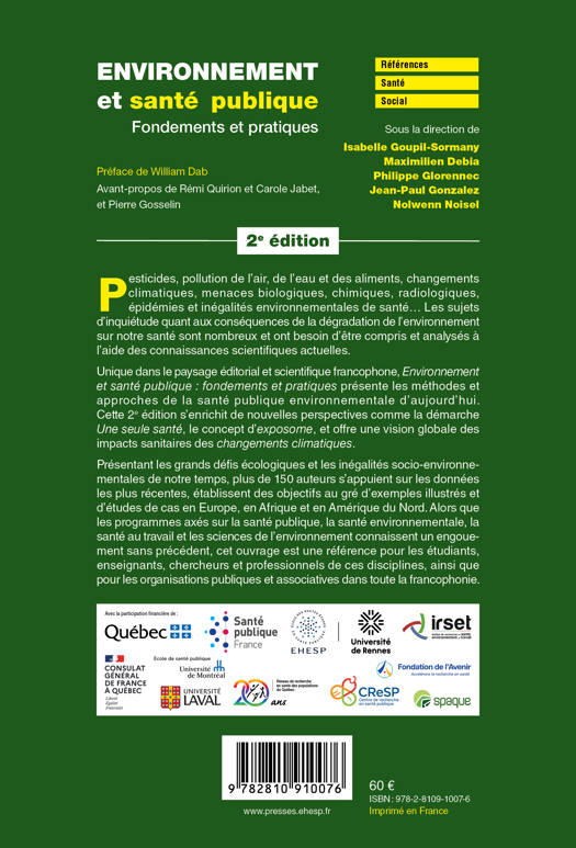 Présentant les grands défis écologiques et les inégalités socio-environnementales de notre temps, plus de 150 auteurs s'appuient sur les données les plus récentes, établissent des objectifs au gré d'exemples illustrés et d'études de cas en Europe, en Afrique et en Amérique du Nord. Alors que les programmes axés sur la santé publique, la santé environnementale, la santé au travail et les sciences de l'environnement connaissent un engouement sans précédent, cet ouvrage est une référence pour les étudiants, enseignants, chercheurs et professionnels de ces disciplines, ainsi que pour les organisations publiques et associatives dans toute la francophonie.
