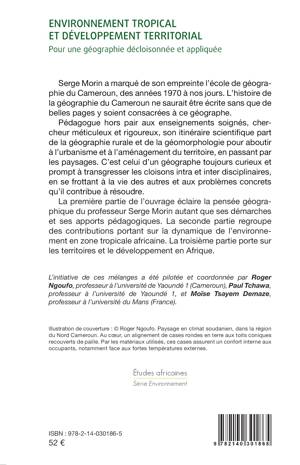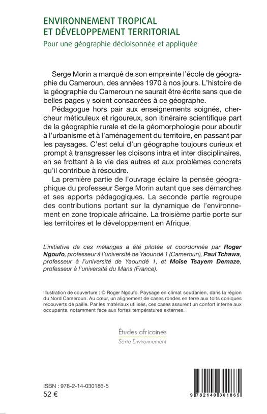 Serge Morin a marqué de son empreinte l'école de géographie du Cameroun, des années 1970 à nos jours. L'histoire de la géographie du Cameroun ne saurait être écrite sans que de belles pages y soient consacrées à ce géographe. Pédagogue hors pair aux enseignements soignés, chercheur méticuleux et rigoureux, son itinéraire scientifique part de la géographie rurale et de la géomorphologie pour aboutir à l'urbanisme et à l'aménagement du territoire, en passant par les paysages. C'est celui d'un géographe toujours curieux et prompt à transgresser les cloisons intra et inter disciplinaires, en se frottant à la vie des autres et aux problèmes concrets qu'il contribue à résoudre. La première partie de l'ouvrage éclaire la pensée géographique du professeur Serge Morin autant que ses démarches et ses apports pédagogiques. La seconde partie regroupe des contributions portant sur la dynamique de l'environnement en zone tropicale africaine. La troisième partie porte sur les territoires et le développement en Afrique.