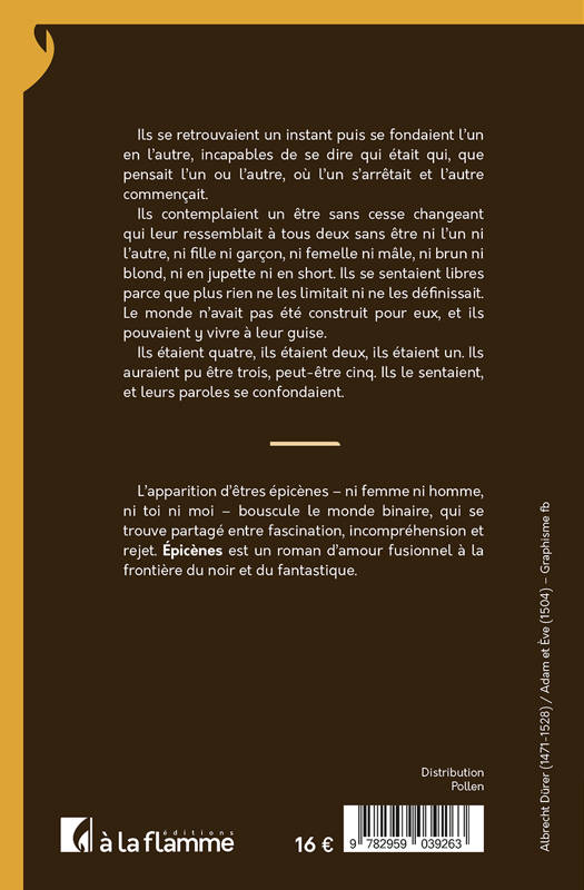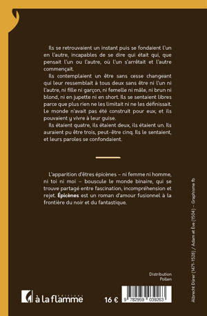 L’apparition d’êtres épicènes – ni femme ni homme, ni toi ni moi – bouscule le monde binaire, qui se trouve partagé entre fascination, incompréhension et rejet. Épicènes est un roman d’amour fusionnel à la frontière du noir et du fantastique.