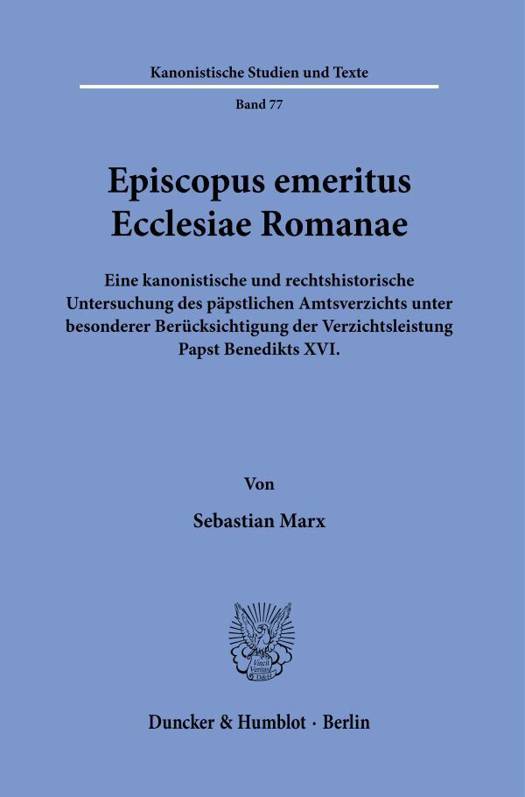 English summary: Episcopus Emeritus Ecclesiae Romanae. A Canonical and Legal-Historical Investigation of the Papal Resignation with Special Reference to the Resignation of Pope Benedict XVI. Based on the example of Pope Benedict XVI. the papal resignation is analysed, whereby the doctrinal foundation, the understanding of the primacy of Ratzinger/Benedict XVI. as well as the canon law-historical genesis of the current legal norm for resignation as well as this itself (c. 332 2 CIC/1983) are taken into account. The need for a separate canonical directive regarding the papal resignation is shown and essential content is presented as a desideratum. German description: Ausgehend vom Beispiel Papst Benedikts XVI. wird der papstliche Amtsverzicht analysiert. Neben einer Untersuchung der lehramtlichen Definitionen zum Papstamt sowie seiner kirchenrechtlichen Grundlage wird sich auch der Primatstheologie Ratzingers/Benedikts XVI. aus dem Blickwinkel seines spateren Pontifikats zugewandt. Die kirchenrechtshistorische Darstellung befasst sich mit dem historischen Exempel Papst Colestins V. und der folgenden rechtlichen Definition. Im Anschluss steht der geltende c. 332 2 des kirchlichen Gesetzbuchs im Vordergrund. Es wird die Notwendigkeit einer eigenen kirchenrechtlichen Weisung bezuglich des papstlichen Amtsverzichts aufgezeigt. Der Episcopus emeritus Ecclesiae Romanae ist jedem anderen emeritierten Bischof rechtlich gleichzustellen. Dennoch gebietet sich der Vorschlag einer lex peculiaris de lege ferenda, die einige klarende Weisungen beinhaltet und das Leben der Communio in grosstmoglicher Weise fordern kann.