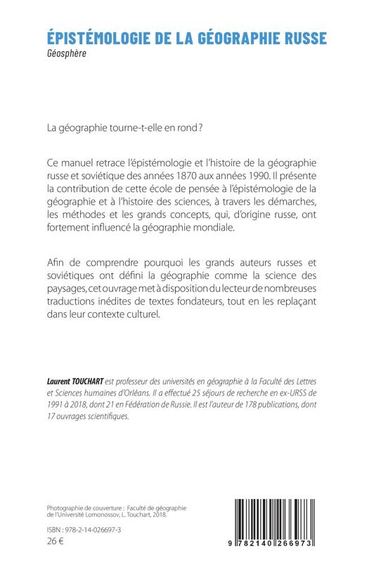 La géographie tourne-t-elle en rond ? Ce manuel retrace l'épistémologie et l'histoire de la géographie russe et soviétique des années 1870 aux années 1990. Il présente la contribution de cette école de pensée à l'épistémologie de la géographie et à l'histoire des sciences, à travers les démarches, les méthodes et les grands concepts, qui, d'origine russe, ont fortement influencé la géographie mondiale. Afin de comprendre pourquoi les grands auteurs russes et soviétiques ont défini la géographie comme la science des paysages, cet ouvrage met à disposition du lecteur de nombreuses traductions inédites de textes fondateurs, tout en les replaçant dans leur contexte culturel.