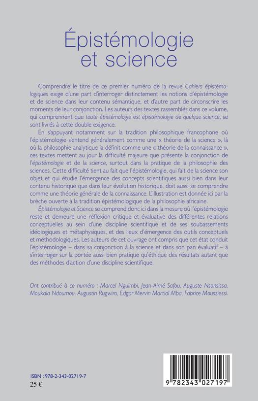 En s'appuyant notamment sur la tradition philosophique francophone, où l'épistémologie s'entend généralement comme une théorie "de la science" et non "de la connaissance", ces textes mettent au jour la difficulté majeure que présente la conjonction de l'épistémologie et de la science, surtout dans la pratique de la philosophie des sciences. L'illustration est donnée ici par une brèche ouverte à la tradition épistémologique de la philosophie africaine.