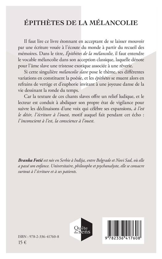 Il faut lire ce livre étonnant en acceptant de se laisser mouvoir par une écriture vouée à l'écoute du monde à partir du recueil des mémoires. Dans le titre, Épithètes de la mélancolie, il faut entendre le vocable mélancolie dans son acception classique, laquelle dénote pour l'âme slave une tristesse exotique associée à une rêverie. Si cette singulière mélancolie slave pose le thème, ses différentes variations en constituent la poésie, et les épithètes se muent alors en refrains de vertige et d'euphorie invitant à une joyeuse danse de la vie dessinant la ronde du temps. Car la texture de ces chants slaves offre un relief ludique, et le lecteur est conduit à abdiquer son propre état de vigilance pour suivre les déclinaisons d'une voix qui célèbre ses expansions, à l'est le désir, l'écriture à l'ouest, motif auquel fait pendant cet écho: l'inconscient à l'est, la conscience à l'ouest.