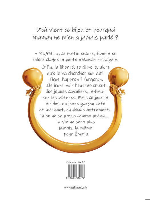 « BLAM ! », ce matin encore, Éponia en colère claque la porte de la maison «Maudit tissage!». Enfin, la liberté, se dit-elle, alors qu'elle va chercher son Ami Ticos, l'apprenti forgeron. Ils iront voir l'entraînement des jeunes cavaliers, là-haut sur les pâtures. Mais ce jour-là Viridos, un jeune garçon bête et méchant, en décide autrement. Rien ne se passe comme prévu⦠La vie ne sera plus jamais la même pour Éponia. Qui est Éponia? Entre Astérix et Yakari, Éponia revisite nos grands classiques. Historique et archéo compatible, cette BD menée au grand galop nous présente une vision renouvelée de l'antiquité celte et romaine. Éponia, et son ami Ticos, iront d'aventures en aventures sous l'Åil bienveillant d'une déesse aux pouvoirs surprenants .