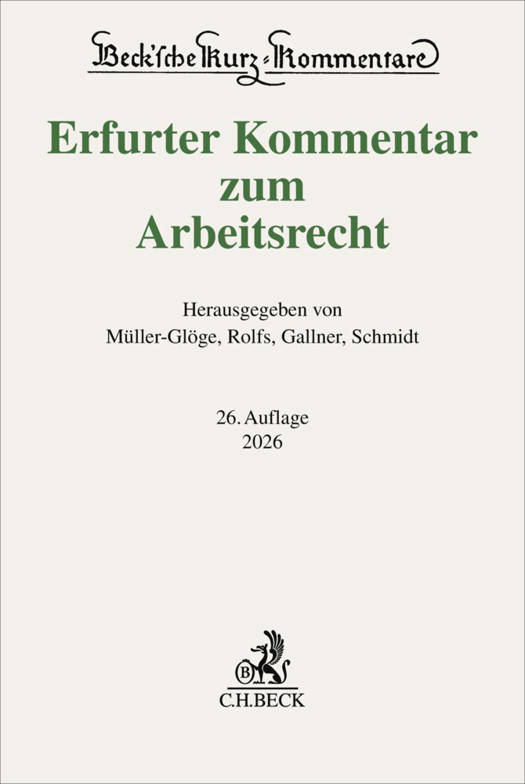 Der "Erfurter" erscheint jährlich und ersetzt eine ganze Bibliothek zum nationalen Arbeitsrecht in einem Band. Herausragende Autorinnen und Autoren kommentieren alle für das Arbeitsrecht relevanten Rechtsvorschriften aus gegenwärtig GG, AEUV, ÄrzteBefrG, AEntG, AGG, AktG, ArbGG, ArbSchG, ArbZG, ATG, AÜG, BBiG, BDSG, BEEG, BetrAVG, BetrVG, BGB, BUrlG, DrittelbG, EFZG, EntgTranspG, FPfZG, GenDG, GeschGehG,GewO, HGB, HinSchG, InsO, JArbSchG, KSchG, MiLoG, MitbestG, Montan-MitbestG, MuSchG, NachwG, PflegeZG, ROM I-VO, SGB III, IV, V, VI, VII und IX, SprAuG, TVG, TzBfG, UmwG, WZVG.