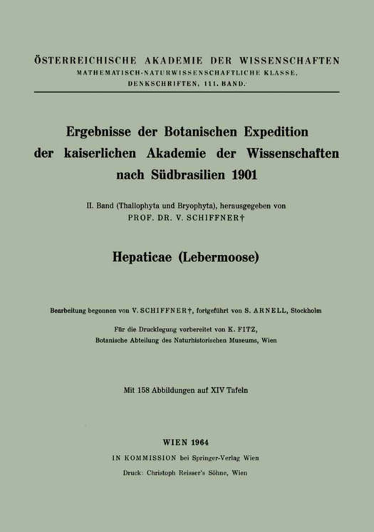 Prof. Dr. Viktor Schiffner t*), Wi, en, brachte als Teilnehmer an der Botanischen Expedition der kaiser- lichen Akademie der Wissenschaften in Wien nach SiidbrasiLien im Jahre 1901 daselbst eine umfangreiche Sammlung von Lebermoosen zustande, die nach seinem Ableben an die Botanische Abteilung des Naturhi- storischen Museums in Wien kam.Einen groBen Teil seiner Aufsammlungen hat Schiffner noch selbst be- arbeitet, seline Ergebnisse sind jedoch nie veroffentlicht worden. Schiffners hinterlassene Auheichnungen hieriiber umfassen fertiggestellte Bearbeitungen einer Reihe von Gattungen sowie begonnene Bearbeitungen einer Reihe weiterer Gattungen, ferner eine groBe Zahl mit dem Zeichenapparat skizzenhaft ausgefiihrter mikroskopischer Bleistiftzeichnungen zu untersuchten Originalexemplaren und neubeschriebenen oder kri- tischen Arten. Durch freundliche Vermittlung von Dr. Herman Persson hat sich Herr Dr. Sigfrid Arnell, Stockholm, III dankenswerter Weise der miihevollen Arbeit unterzogen, diese Aufzeichnungen zu einem Manuskript zusammenzustellen, Unvollendetes zu Ende zu fiihren und Fehlendes an Hand des Schiffnerschen Pflanzen- materials zu ergiinzen. Dabei wurde der von Schiffners Hand bereits vorliegende Text nur in sprachlicher oder formeller Hinsicht geandert, nicht aber in sachlicher Hinsicht; seine Auffassung von Arten, Varietaten und Formen ist die zu seiner Zeit iibliche; sie entspricht daher nicht der heute herrschenden. Insbesondere war ihm der Begriff der Modifikation (etwa im Sinne Buchs) ganz fremd.