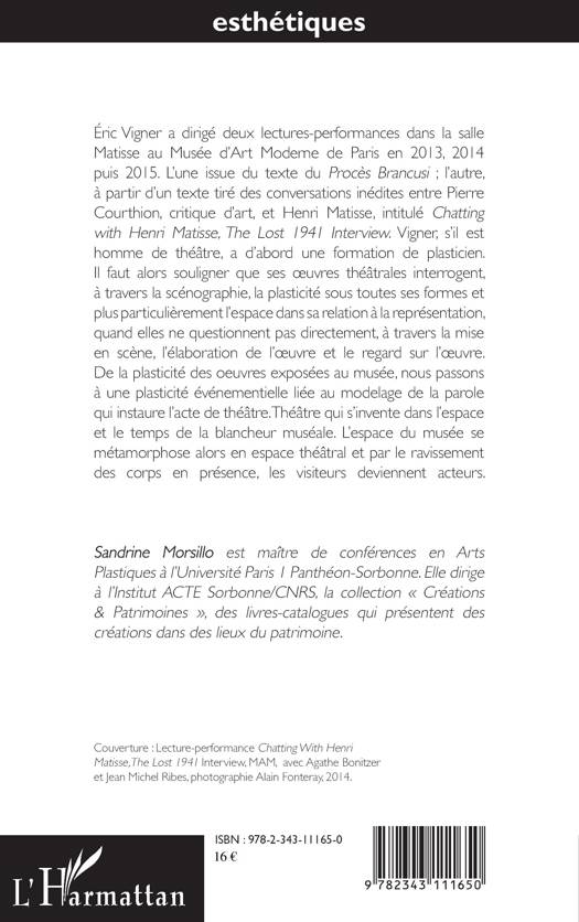 Éric Vigner, s'il est homme de théâtre, a d'abord une formation de plasticien. Ses uvres théâtrales interrogent, à travers la scénographie, la plasticité sous toutes ses formes et plus particulièrement l'espace dans sa relation à la représentation, quand elles ne questionnent pas directement, à travers la mise en scène, l'élaboration de l'uvre et le regard sur l'uvre. De la plasticité des uvres exposées au musée, nous passons à une plasticité événementielle liée au modelage de la parole qu'instaure l'acte de théâtre. Théâtre qui s'invente dans l'espace et le temps de la blancheur muséale.