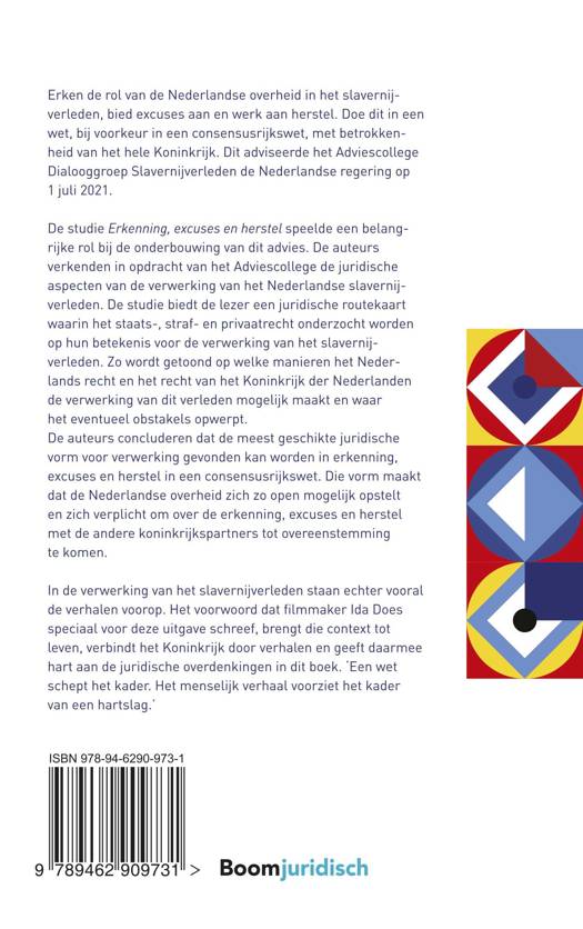 De studie Erkenning, excuses en herstel speelde een belangrijke rol bij de onderbouwing van dit advies. De auteurs verkenden in opdracht van het Adviescollege de juridische aspecten van de verwerking van het Nederlandse slavernijverleden. De studie biedt de lezer een juridische routekaart waarin het staats, straf en privaatrecht onderzocht worden op hun betekenis voor de verwerking van het slavernijverleden. Zo wordt getoond op welke manieren het Nederlands recht en het recht van het Koninkrijk der Nederlanden de verwerking van dit verleden mogelijk maakt en waar het eventueel obstakels opwerpt. De auteurs concluderen dat de meest geschikte juridische vorm voor verwerking gevonden kan worden in erkenning, excuses en herstel in een consensusrijkswet. Die vorm maakt dat de Nederlandse overheid zich zo open mogelijk opstelt en zich verplicht om over de erkenning, excuses en herstel met de andere koninkrijkspartners tot overeenstemming te komen.