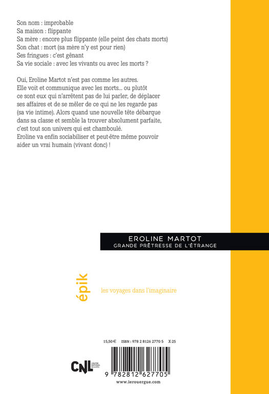 Son nom évoque une folle aux chats dans un manoir hanté. Elle déteste la lumière du soleil. Dans la cour, elle parle toute seule. Sa mère peint des squelettes de chat. Oui, Eroline Martot n'est pas comme les autres. Peut-être parce qu'elle a la faculté de voir les morts. Ce sont d'ailleurs ses seuls amis : Nancy, Maryline, Haidar et son chat Lupin, ça fait du monde et du bruit. Difficile de paraître normale, de sociabiliser avec les vivants... Alors quand Jackie débarque dans sa classe et semble trouver Eroline absolument parfaite, c'est tout son univers qui vacille.