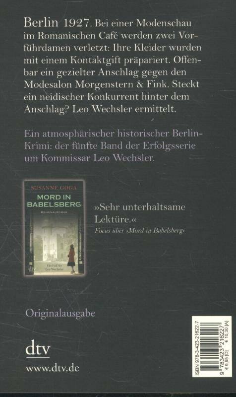 Berlin 1927. Bei einer Modenschau im 'Romanischen Café' werden zwei Vorführdamen verletzt: Ihre Kleider wurden mit einem Kontaktgift präpariert. Offenbar ein gezielter Anschlag gegen den Modesalon 'Morgenstern & Fink', den aufsteigenden Stern am Berliner Modehimmel. Steckt ein Konkurrent dahinter? Kurz darauf wird in Schöneberg ein Toter gefunden. In seiner Wohnung entdeckt man einen Prospekt des Modesalons. Leo Wechsler, inzwischen Oberkommissar bei der Berliner Kripo, nimmt die Ermittlungen auf.