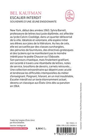 Son parcours chaotique, mais finalement gratifiant, est raconté à travers une ribambelle de lettres, notes de service, brouillons de devoirs, carnets retrouvés… Une collection extraordinaire qui dépeint avec acuité et tendresse les difficultés intemporelles du métier d’enseignant. Poignant, hilarant, en un mot inoubliable, Escalier interdit est un texte étonnamment actuel, devenu classique aux États-Unis dès sa parution en 1964.