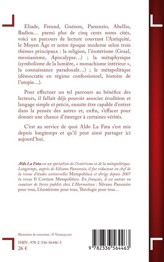 Eliade, Freund, Guénon, Panunzio, Abellio, Badiou... parmi plus de cinq cents noms cités, voici un parcours de lecture couvrant l'Antiquité, le Moyen Âge et notre époque moderne selon trois thèmes principaux: la religion, l'ésotérisme (Graal, messianisme, Apocalypse...); la métaphysique (symbolisme de la lumière, monachisme intérieur, la connaissance paradoxale...); le métapolitique (démocratie en régime confessionnel, histoire de l'utopie...). Pour effectuer un tel parcours au bénéfice des lecteurs, il fallait déjà pouvoir associer érudition et langage simple et précis, ensuite être capable d'entrer dans la pensée des autres et, enfin, s'effacer pour donner une chance d'émerger à certaines vérités. C'est au service de quoi Aldo La Fata s'est mis depuis longtemps et qu'il peut ainsi partager ici aujourd'hui.