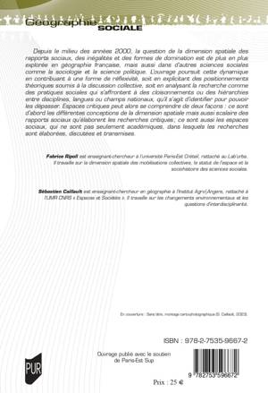 Depuis le milieu des années 2000, la question de la dimension spatiale des rapports sociaux, des inégalités et des formes de domination est de plus en plus explorée en géographie française, mais aussi dans d’autres sciences sociales comme la sociologie et la science politique. L’ouvrage poursuit cette dynamique en contribuant à une forme de réflexivité, soit en explicitant des positionnements théoriques soumis à la discussion collective, soit en analysant la recherche comme des pratiques sociales qui s’affrontent à des cloisonnements ou des hiérarchies entre disciplines, langues ou champs nationaux, qu’il s’agit d’identifier pour pouvoir les dépasser. Espaces critiques peut alors se comprendre de deux façons : ce sont d’abord les différentes conceptions de la dimension spatiale mais aussi scalaire des rapports sociaux qu’élaborent les recherches critiques ; ce sont aussi les espaces sociaux, qui ne sont pas seulement académiques, dans lesquels les recherches sont élaborées, discutées et transmises.