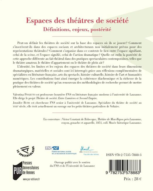 Peut-on définir les théâtres de société sur la base des espaces où ils se jouent ? Comment s’inscrivent-ils dans des espaces sociaux et architecturaux non initialement prévus pour des représentations théâtrales ? Comment s’organise dans ce contexte le lien entre l’espace signifiant, celui de la scène, et l’espace signifié, celui de l’action dramatique ? Quelle est enfin la postérité de cette approche différente au fait théâtral dans des pratiques spectaculaires contemporaines, telles que le théâtre amateur, le théâtre d’appartement ou le théâtre de plein air ? L’identité, les limites et les enjeux des espaces des théâtres de société dans leurs dimensions dramaturgiques, matérielles et sociales sont ici interrogés grâce aux réflexions complémentaires de spécialistes en littérature française, arts du spectacle, histoire culturelle, histoire de l’art et humanités numériques. Les contributions font ainsi émerger la cohérence diachronique et la richesse de la pratique des théâtres de société qu’un renouveau des méthodologies de recherche permet de mettre pleinement en valeur.