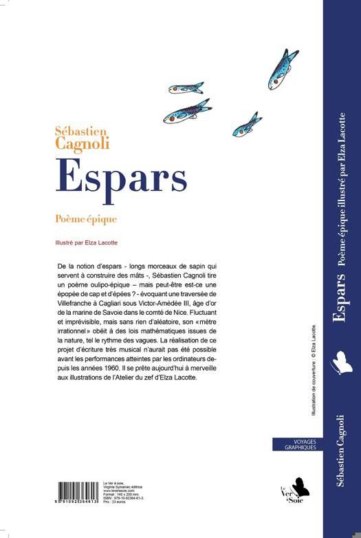 De la notion d'espars - longs morceaux de sapin qui servent à construire des mâts -, Sébastien Cagnoli tire un poème oulipo-épique – mais peut-être est-ce une épopée de cap et d’épées ? - évoquant une traversée de Villefranche à Cagliari sous Victor-Amédée III, âge d'or de la marine de Savoie dans le comté de Nice. Fluctuant et imprévisible, mais sans rien d’aléatoire, son « mètre irrationnel » obéit à des lois mathématiques issues de la nature, tel le rythme des vagues. La réalisation de ce projet d’écriture très musical n’aurait pas été possible avant les performances atteintes par les ordinateurs depuis les années 1960. Il se prête aujourd’hui à merveille aux illustrations de l'Atelier du zef d'Elza Lacotte. Le récit ci-après s’est accompli lors des grands voyages de mon père il me l’a dit il me l’a raconté c’est vrai c’est réel n’est ni rêve ni mensonge car mon père il a longtemps servi comme matelot dans la marine et le soir à Villefranche il disait il racontait ceci là