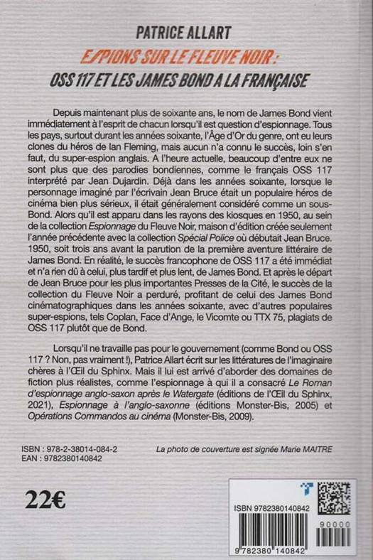 Depuis maintenant plus de soixante ans, le nom de James Bond vient immédiatement à l'esprit de chacun lorsqu'il est question d'espionnage. Tous les pays, surtout durant les années soixante, l'Âge d'Or du genre, ont eu leurs clones du héros de Ian Fleming, mais aucun n'a connu le succès, loin s'en faut, du super-espion anglais. A l'heure actuelle, beaucoup d'entre eux ne sont plus que des parodies bondiennes, comme le français OSS 117 interprété par Jean Dujardin. Déjà dans les années soixante, lorsque le personnage imaginé par l'écrivain Jean Bruce était un populaire héros de cinéma bien plus sérieux, il était généralement considéré comme un sous-Bond. Alors qu'il est apparu dans les rayons des kiosques en 1950, au sein de la collection espionnage du Fleuve Noir, maison d'édition créée seulement l'année précédente avec la collection Spécial Police où débutait Jean Bruce. 1950, soit trois ans avant la parution de la première aventure littéraire de James Bond. En réalité, le succès francophone de OSS 117 a été immédiat et n'a rien dû à celui, plus tardif et plus lent, de James Bond. Et après le départ de Jean Bruce pour les plus importantes Presses de la Cité, le succès de la collection du Fleuve Noir a perduré, profitant de celui des James Bond cinématographiques dans les années soixante, avec d'autres populaires super-espions, tels Coplan, Face d'Ange, le Vicomte ou TTX 75, plagiats de OSS 117 plutôt que de Bond. Lorsqu'il ne travaille pas pour le gouvernement (comme Bond ou OSS 117 ? Non, pas vraiment !), Patrice Allart écrit sur les littératures de l'imaginaire chères à l'OEil du Sphinx. Mais il lui est arrivé d'aborder des domaines de fiction plus réalistes, comme l'espionnage à qui il a consacré Le roman d'espionnage anglo-saxon après le Watergate (éditions de l'OEil du Sphinx, 2021), espionnage à l'anglo-saxonne (éditions Monster-Bis, 2005) et Opérations Commandos au cinéma (Monster-Bis, 2009).