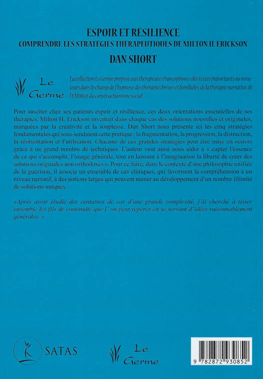 Traduction française de "Hope and Resiliency: understanding the Pychotherapeutic Strategies of Milton H. Erickson" Pour susciter chez ses patients espoir et résilience, ces deux orientations essentielles de ses thérapies, Milton H. Erickson inventait dans chaque cas des solutions nouvelles et originales, marquées par la créativité et la souplesse. Dan Short nous présente ici les cinq stratégies fondamentales qui sous-tendaient cette pratique : la fragmentation, la progression, la distraction, la réorientation et l'utilisation. Chacune de ces grandes stratégies peut être mise en oeuvre grâce à un grand nombre de techniques. L'auteur veut ainsi nous aider à « capter l'essence de ce qui s'accomplit, l'image générale, tout en laissant à l'imagination la liberté de créer des solutions originales non orthodoxes ». Pour ce faire, dans le contexte d'une philosophie unifiée de la guérison, il associe un ensemble de cas cliniques, qui favorisent la compréhension à un niveau narratif, à des notions larges qui peuvent mener au développement d'un nombre illimité de solutions uniques. « Après avoir étudié des centaines de cas d'une grande complexité, l'ai cherché à tisser ensemble les fils de continuité que l'on peut repérer en se servant d'idées raisonnablement générales. »