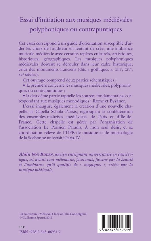 Cet ouvrage se divise en deux parties : la première concerne les musiques médiévales, polyphoniques ou contrapuntiques ; la deuxième rappelle les sources fondamentales -Rome et Byzance- correspondant aux musiques monodiques. L'essai inaugure aussi la création d'une nouvelle chapelle -La Capella Schola Parisis- regroupant la confédération des ensembles-maîtrises médiévistes de Paris et d'Ile-de-France.
